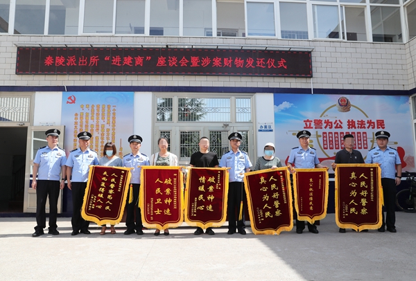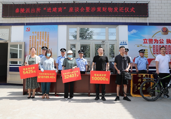 7月10日,公安临潼分局秦陵派出所邀请辖区各行业代表召开“进建商”座谈会,同时向受害群众发还70余万元涉案财物。